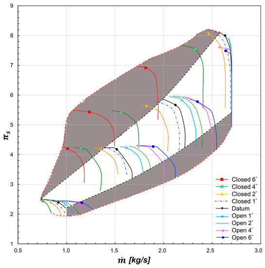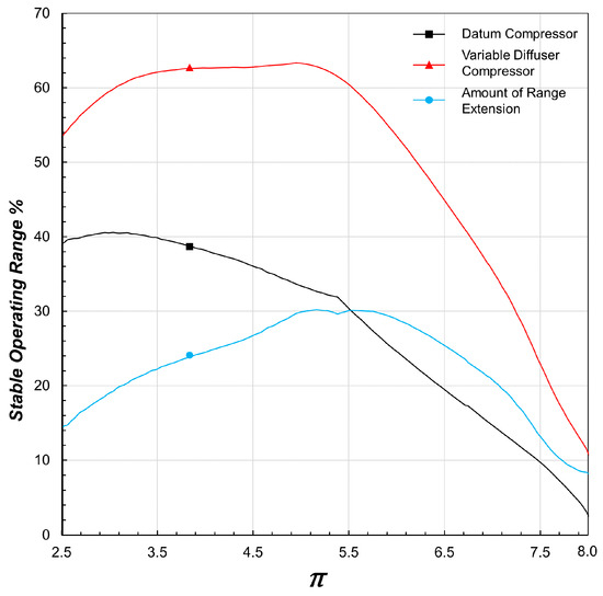 - A variable vaned diffuser can significantly improve the operating range of centrifugal compressors. The effects of a variable vaned diffuser on high pressure ratio centrifugal compressors are verified. The stable operating range extended at different pressure ratio levels. There is an increase of 30.0% in the operating range of the current case for pressure ratios between 5.0 and 6.0. At higher rotational speeds, the main contributor to range extension is the shifting of the surge line to lower mass flow rates, which is due to the closing of the diffuser. At lower rotational speeds, changing the angle of diffuser vanes has minimal impact on the surge mass flow rate while it significantly shifts the choke line. At medium rotational speeds, both surge and choke lines shift by changing the diffuser vane angle. Thus, both contribute to extending the operating range.