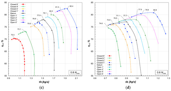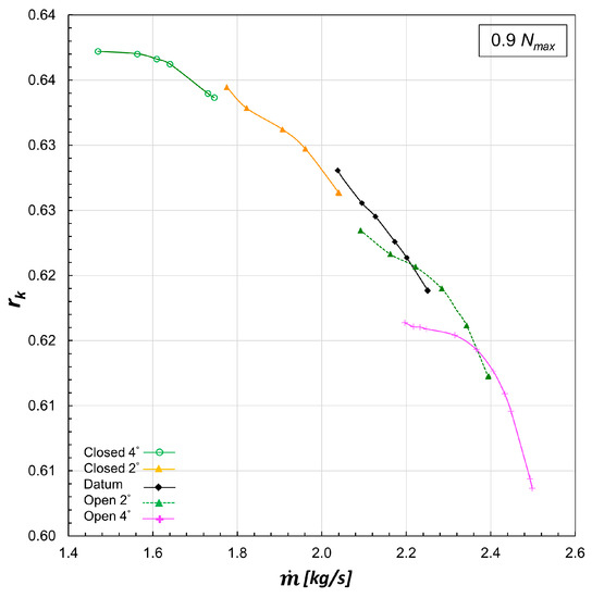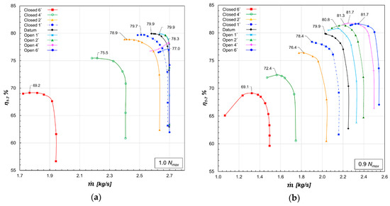 - A variable vaned diffuser has a significant impact on the compressor’s efficiency. At higher rotational speeds, the choke mass flow of the diffuser is matched by that of the impeller. Thus, opening the diffuser at these speed neither shifts the choke line nor improves the efficiency. At lower rotation speeds, however, the impeller and diffuser are not matched and choking happens at the diffuser. Because of this, opening the diffuser extends the operating range by shifting the choke line to higher mass flows and increases the efficiency of the stage by up to 4.5% at 0.8Nmax by improving the matching between impeller and diffuser.