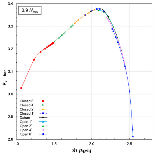 - Zheng, X.; Zhang, Y.; Yang, M.; Bamba, T.; Tamaki, H. Stability Improvement of High-Pressure-Ratio Turbocharger Centrifugal Compressor by Asymmetrical Flow Control—Part II: Nonaxisymmetrical Self-Recirculation Casing Treatment. J. Turbomach. 2012, 135, 21007. [Google Scholar] [CrossRef] [PubMed]