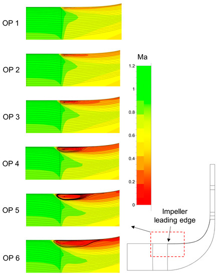 - At each rotation speed, there is a certain mass flow rate for the impeller where the incidence angle at the impeller leading edge reaches a critical point. Because of the high incidence angle, instability and separation vortexes will arise in the near-tip region of the impeller as the mass flow rate decreases. This critical point is independent of diffuser settings and stage-wide working conditions such as choke or surge, which means even when the stage is in a stable condition there might be large separation vortexes at the near-tip region of the impeller. The instability in the impeller will grow larger with a further decrease in the mass flow rate.