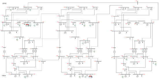 Both of the proposed models are tested on a modernized IEEE RTS-96 system, as shown in Figure 1 [19], with wind power plants and ESS devices [23,25]. The case study network consists of three areas, where the first area contains nine wind farms (w1–w9) with overall capacity of 3900 MW; the second area contains six wind farms (w10–w16) with overall capacity of 2400 MW; and the third area contains three wind farms (w17–w19) with overall capacity of 300 MW. Although the test system is a generic IEEE network, the wind topography replicates the Electric Reliability Council Of Texas (ERCOT) system, where the power flows are directed from the west zone, with abundant wind generation, to the east zone, with large loads [26]. ESS units are connected to buses where the significant wind power is injected into the grid.