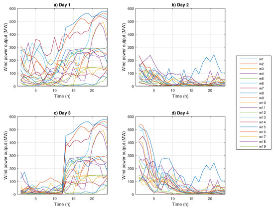 The generated wind output data are based on 10-min wind speed data applied to aggregated Vestas V90-3 MW wind turbines to obtain power outputs at locations in the western USA in the period of 2004–2006. These data are a part of the NREL’s Western Wind dataset [27]. The dataset contains 32,043 sites, which are combined in order to signify the locations of large capacity wind farms connected at buses into the transmission network. The wind speed data from the database were first converted into the wind power data using the wind turbine power curve. The data from 2004–2005 were selected as input in the model, while the data from 2006 were used in the process of calibration. Similarly to [28], the first step is to normalize the wind speed data in a way that each point is subtracted by the average of the corresponding month, and the second step is to divide it by the standard deviation of the corresponding hour of the month. The following step is to obtain stationary Gaussian distributed series by the undesirable data with the empirical distribution function. These time series are fitted to normalized data, as elaborated in [19]. Every model is updated with a step of six hours in which data are used by the 120 most recent hours of wind data in 2006, and followed by each update, each model provides a new six-hour prediction. Following a scenario reduction technique from [29], we used four representative days from this dataset.