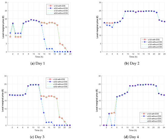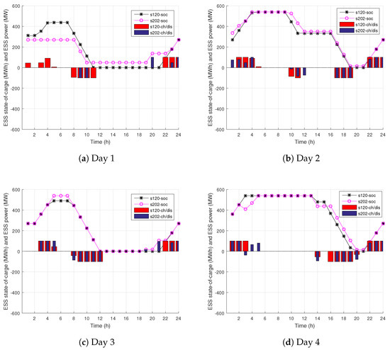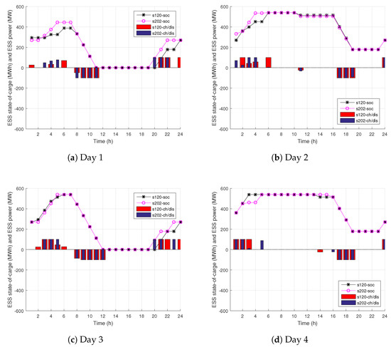 ESS operation in market-based environment is shown in Figure 5. On representative Day 1, ESS at Bus 202 is not charged in the morning due to relatively high LMPs (compare with Figure 4a). Instead, only ESS at Bus 120 is charged, due to lower LMPs. Since the LMPs are highest in Time Periods 8–11, both ESS are discharged in the late morning. LMPs at Bus 202 fall to zero at Hour 18 and stay zero until the end of the day, which is why ESS at Bus 202 is charged to the required capacity in the late evening. LMPs at Bus 120 are lowest towards the end of the day, as well, making this time of the day favorable for charging. On Day 2, both ESS fully charge in the morning. Although the morning prices are higher than on Day 1, both ESS fully charge because the afternoon LMPs are much higher, making it profitable for ESS to perform arbitrage. Days 3 and 4 are similar in the way that ESS charge in the morning and discharge during peak price hours. For Day 3, these peak price hours are 8–12, while for Day 4, they occur in the late afternoon. Note that ESS at Bus 202 performs arbitrage between Hours 2 and 3 of Day 4 due to the local price spike.