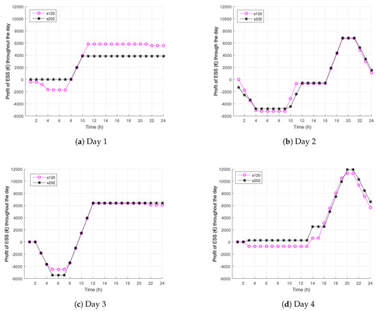 Figure 6 shows cumulative ESS profit throughout the day for each representative day. In almost all cases, ESS first purchases energy, resulting in negative profit, then sells energy, reaching its positive peak profit. The profit is then decreased in most of the cases because of the constraint imposing 50% state of charge at the end of the time horizon. During Day 1, ESS at Bus 202 does not start with negative profit (Figure 6a) because this ESS is not charged during the night (Figure 5a). During Day 4, ESS at Bus 202 is charged at zero LMP and performs arbitrage between Hours 2 and 3, which brings it to a positive profit in the early hours (Figure 6a).