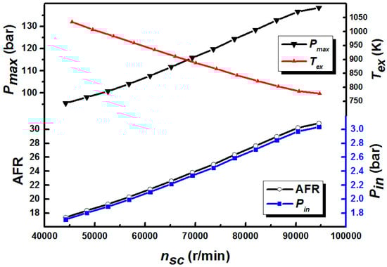 With the increase of nsc, pin and pmax and AFR increase monotonously at the rate of 4.0×10−5 bar/(r/min), 7.3×10−4 bar/(r/min) and 2.8×10−4 1/(r/min), respectively. Meantime Tex decreases at the rate of 4.410−3 K/(r/min). In addition, the engine net power Pnet rises from 44,200 r/min to 67,000 r/min and then declines from 67,000 r/min to 94,600 r/min. As nsc increases, pin increases which can help to improve thermal efficiency; however, as can be seen from Figure 3, the power consumption of the supercharger will be high when nsc is too large, that’s why the power decreases then.
