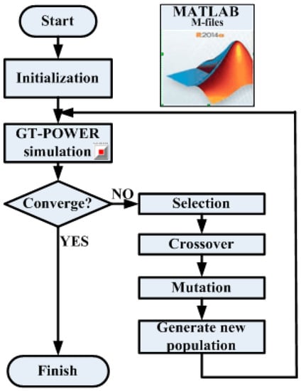 To make it easier for optimization, the GT-POWER engine model is integrated into a co-simulation environment with MATLAB m-file, and the corresponding system block diagram can be seen in Figure 4. Simulation parameters are transmitted from MATLAB to GT-POWER, and then the engine numerical model is run. When the GT-POWER simulation is finished, GT-POWER will transmit the results such as Pnet, pmax, Tex and ntc back to MATLAB. Using these simulation results, Equations (1)–(8) are calculated to judge whether the optimization is converged, if not, the genetic processes will continue until it converged. GA input parameters are specified in Table 4.