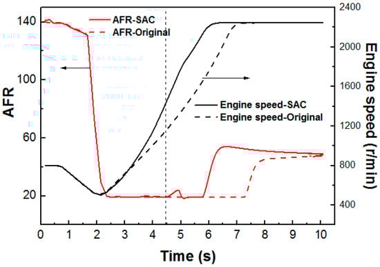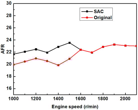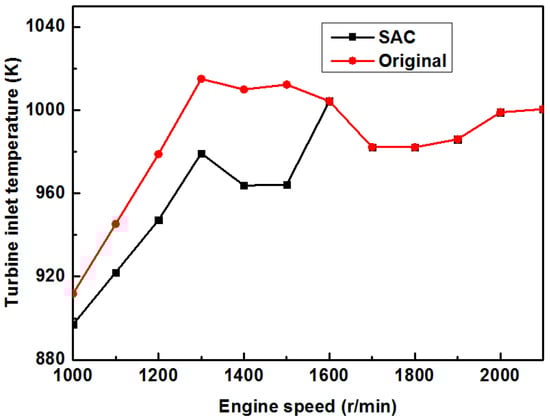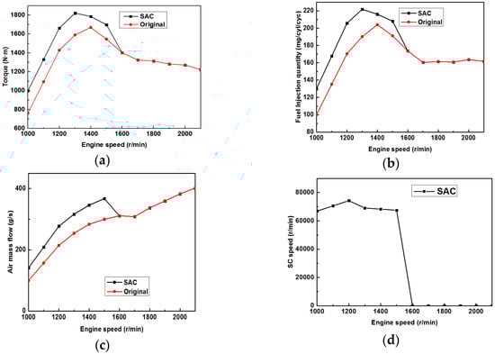 Figure 5a shows the torque output of the SAC engine at full load under various engine speeds. The torque has a certain improvement compared to the original engine when the engine speed n < 1600 r/min. when the engine speed n > 1600 r/min, the torque of the original engine is higher than that of SAC. That is why at the supercharger operation is stopped. The peak torque point is moved from 1400 r/min to 1300 r/min and has a significant increment of 9%. What’s more, the torque at 1000 r/min has increased by 31% compared to that of the original engine. However, the torque of SAC system is virtually identical with that of the original engine when n > 1600 r/min. The reason is that the same turbocharger is used in these two schemes. Figure 5a,b show that the torque and fuel injection quantity have the same varying tendency. The increment of air mass flow (Figure 5c) leads to much more fuel injection which helps to increase the torque and power. Figure 5d shows the variation of nsc.