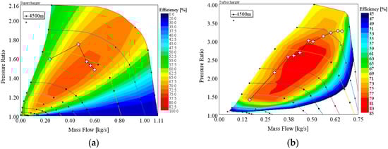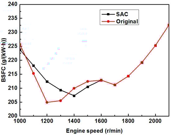 Figure 6 shows fuel consumption comparison between the SAC engine and original engine. The BSFC of the SAC engine is higher than that of the original engine when 1000 r/min < n < 1300 r/min (the maximum increment is restricted within 5%). This is because a significant amount of effective power is consumed by the supercharger. The phenomenon changes as the engine speeds up, due to the rise in efficiency both of the supercharger and turbocharger. This can be seen from Figure 7a,b, respectively.