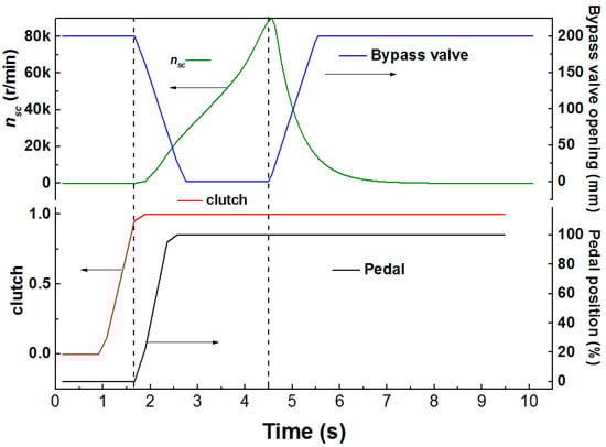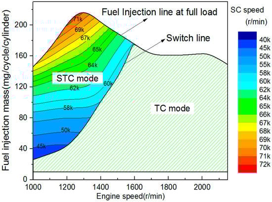 The rotation speed MAP of the overall working conditions is shown in Figure 10. There is a very clear line which divides the overall area into ‘STC mode’ and ‘SC mode’. The nsc increases with the increasing load under STC mode.