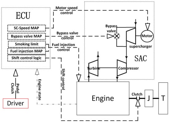 Vehicle model is built on the GT-Power platform. Figure 11 shows the model architecture including the engine, the SAC system, ECU and equivalent moment of inertia of the vehicle J’ and torque resistance from the wheel. Ignoring the elastic damping element of drive train, J’ can be calculated using Equations (9)–(11) and expressed by Equation (12):