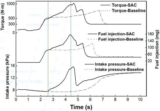 A similar vehicle model with an original engine is built and run to make a comparison. Comparison results are shown in Figure 13 and Figure 14. The SAC engine speeds up faster than the original one and can reduce the acceleration time by 20%. What’s more, the SAC engine has much higher intake pressure which allows much more fuel to be injected into the cylinder (Figure 14). That is why the torque of the SAC engine is higher than that of the original engine.