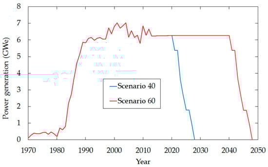 - The information of the Spanish nuclear fleet performance was taken from the Power Reactor Information System (PRIS) [8] up to year 2012. Beyond that date, the energy production was projected considering the corresponding decommissioning dates assumed on each scenario (different for scenarios 40 and 60), as shown in Figure 1. The total energy estimations for 40 and 60 years for the whole cycle are 2178 TWhe and 3277 TWhe, respectively. For the sake of this study, no new reactors are considered to be built.