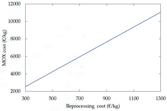 Figure 2. MOX cost as a function of the reprocessing cost for a SF with an average burn-up of 40 GWd/tU.