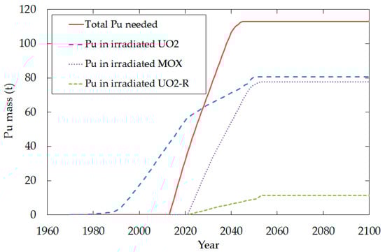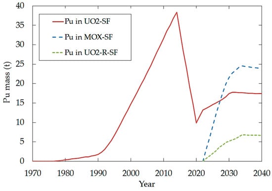 Additionally, scenarios 60 show a practical limitation because there is a period when the Pu for MOX fuel fabrication coming from the reprocessing of UO2-SF is not available. Around 32.4 t of Pu on loan are needed to avoid this limitation. In this work, it is assumed that this Pu amount is borrowed from an external supplier and given back at EOC. This is the consequence of the hypothesis that the technology to reprocess the UO2-R-SF and the MOX-SF (other sources of Pu that could provide the Pu demands on time) is only available at EOC.