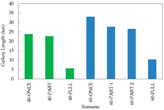 Regarding mass limit, the maximum number of assemblies allowed per package is 4 for UO2-PWR assemblies, 12 for UO2-BWR assemblies, 1 for MOX assemblies, and 3 Universal Containers for HLWr. To simplify the FD model, all the UO2 fuel is considered as PWR assemblies. According to [18], the maximum thermal power by canister in Spanish FD is 1.2 kW in order to avoid temperatures above 100 °C between the packages and the bentonite layer (engineering barrier located between the waste and the host rock). Considering the total number of packages coming from the application of these hypotheses (Table 9), the gallery length required in the FD has been calculated for the different scenarios. Results are shown in Figure 5. For scenarios 40, this figure shows that the partial reprocessing implies a small reduction on the gallery length compared to 40-ONCE (22.7 km vs. 23.9 km for Scenario 40-ONCE). This is caused because of the MOX storing assumptions: a significant gap between canisters containing MOX of 6.5 m is needed for the previously described thermal constraints. This also happens in 60-PART-1 and 60-PART-2 scenarios, with respective values of 27.8 km and 26.7 km vs. 33.1 km for Scenario 60-ONCE. For full reprocessing, in scenarios 40 and 60, the required gallery length is significantly reduced (in a factor 4 and 3, respectively, with total gallery length values of 5.7 km for Scenario 40-FULL and 10.4 km for Scenario 60-FULL).