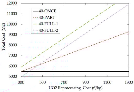 Both scenarios 40-PART and 40-FULL (see Figure 3) have similar costs except for the cost for reprocessing the extra material at EOC, which only appears in scenario 40-PART. This cost has small importance if the cost of reprocessing is small (around 300 €/kg), but it becomes the major contributor for high reprocessing costs.