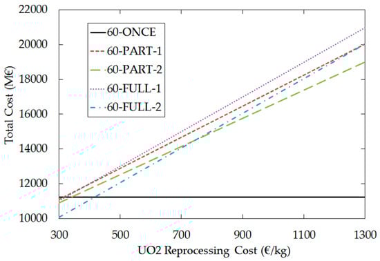Impact of a modification in the uranium cost for scenarios 60. Note that the upper limit of the UO2 reprocessing cost (x-axis) shown in the figure is 900 €/kg.