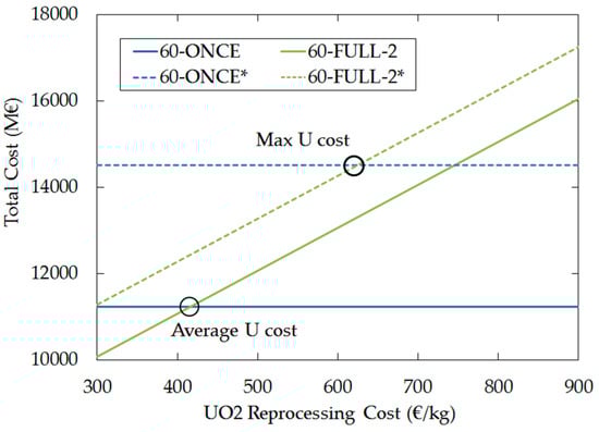 The cost of the once-through scenario depends mainly on the uranium price. The impact of changes in this uranium price for scenario 60 has been also explored in this work. Results are shown in Figure 8, where the dashed lines for both scenarios 60-ONCE* and 60-FULL-2* represent the total cost if the uranium average cost between 2014 and the EOC is fixed as the historical highest cost of 230 €/kgU3O8. This increase in the uranium cost leads to a significantly larger cost of the scenario, from ~11,200 M€ to ~14,500 M€. On the other hand, scenarios with reprocessing do not have such significant dependence on the uranium cost. For scenario 60-FULL-2, where the extra material is considered as an asset, the total scenario cost is increased in ~1200 M€.