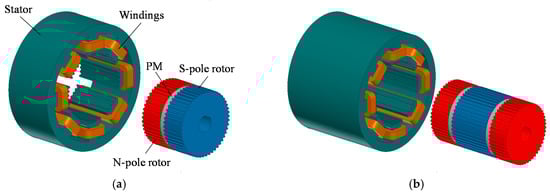 Figure 1a shows the configuration of the most commonly used 2-phase 8-pole 50-rotor-tooth HSM, in which concentrated windings are adopted, two identical rotor stacks are displaced axially along the rotor and staggered in angle by one-half the rotor tooth pitch, while the stator pole structure is continuous along the length of the rotor. Unlike the multi-stack VR stepping motor, in the HSM, the two rotor stacks are separated by an axially magnetized PM. As a result, one end of the rotor can be considered as a north magnetic pole and the other end as a south magnetic pole. In addition, the motor configuration with multiple PMs and rotor stacks is generally adopted for an increased stator core length [20], as shown in Figure 1b, in order to improve the torque producing ability.