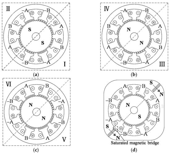 An equivalent transformation from the normal HSM to the novel SHSM is shown in Figure 2. Figure 2a,b show the schematic end view of the HSM. By symmetry, Figure 2a can be divided into two identical parts, i.e., I = II, so for Figure 2b III = IV. Supposing the rotor in Figure 2b rotates one-half a tooth pitch, and simultaneously all the stator windings are inversely supplied, then Figure 2c can be obtained. It can be seen that Figure 2c is exactly equivalent to Figure 2b, and that it can be identically divided into two parts, i.e., V = VI. Interestingly, Figure 2a has the same rotor position as that of Figure 2c. It is suitable to select one part of each, e.g., part I and part VI, and assemble them together to constitute a novel motor structure, in which the polarities of both the stator and rotor poles can be produced by using two PMs symmetrically embedded in the stator yoke and magnetized in the opposite direction, as shown in Figure 2d; thus, the novel SHSM is finally obtained. It should be emphasized that the saturated magnetic bridge shown in Figure 2d is usually adopted to keep the stator lamination sheets in one piece and solve problems in series manufacturing while maintaining the very small desired air-gap, and that the width of the magnetic bridge is designed to be as small as possible to reduce the PM flux leakage.