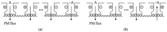 where Λt0 and Λt1 are the constant and fundamental permeance components of one tooth-layer, and the PM height hpm is neglected. Assuming that the relative permeability of the iron core is infinity, the superposition principle can be applied to the magnetic circuits. Firstly, setting the phase currents ia = 0 and ib = 0, the flux ϕ and ϕ produced by the PM alone can be obtained as