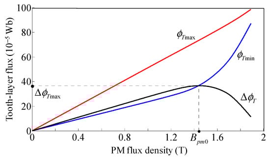 where Nph is the phase winding turns, Zs is the stator teeth per stator pole, and ϕTmax and ϕTmin represent the tooth-layer PM flux at the tooth-tooth position and tooth-gap position, respectively. Figure 5 shows the relationships of ∆ϕT, ϕTmax, and ϕTmin with respect to the air-gap PM flux density Bpm obtained by 2-D FEA, in which t is the tooth width, g is the air-gap length, and λ is the tooth pitch. It can be found that ∆ϕT reaches its maximum value ∆ϕTmax when Bpm = Bpm0, signifying the maximum PM torque according to Equations (9) and (10), and Bpm0 can thus be defined as the optimal PM flux density.