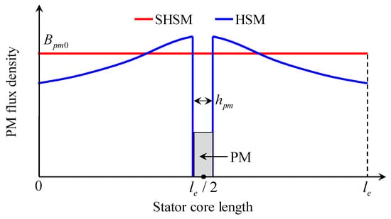 In terms of [2,18], the axial distribution of Bpm along the stator core length in the HSM (with single PM and two rotor stacks) is non-uniform and would take the form of Figure 6, where hpm is the PM height in the magnetizing direction, taking into account the inter-lamination air-gaps. On the contrary, the axial distribution of Bpm along the stator core length is uniform in the SHSM, which can be designed as Bpm0 by using 2-D FEA or even the more accurate 3-D FEA.
