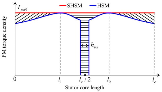 Figure 7 shows the axial distribution of the PM torque density of the two motors based on Figure 6, in which Tpm0 represents the maximum PM torque of the unit stator core length (1 m) corresponding to the optimal PM flux density Bpm0, l1 and l2 represent the axial position where the PM flux density of the two motors are the same, and the shaded area represents the torque losses of the HSM compared to the SHSM.