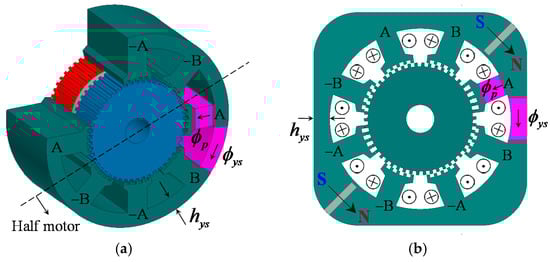 Assuming that the two motors have the same stator pole width wp and minimum stator yoke thickness hys (as shown in Figure 8), the maximum flux density of the stator pole Bpmax and stator yoke Bysmax can be determined according to Equation (11) and compared as