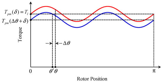 Since sinusoidal currents are employed for driving the motor, the drive must be based on the so-called micro-stepping principle [22]. In the open-loop operation, assuming that the ideal sinusoidal currents ia = Imcos (θ + δ), ib = Imsin (θ + δ) are employed, the ideal micro-step angle is infinitesimal, and then the relationships with respect to the given rotor position θ, given load torque Tl, given torque angle δ, and actual rotor position θ’ can be derived in terms of Equations (8) and (9) as