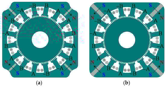 Configurations of the 2-phase 16-pole 100-rotor-tooth SHSM. (a) With high-grade PMs; (b) With low-grade PMs.
