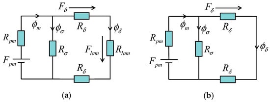 Simplified equivalent magnetic circuits for the PM of the two motors. (a) HSM; (b) SHSM.