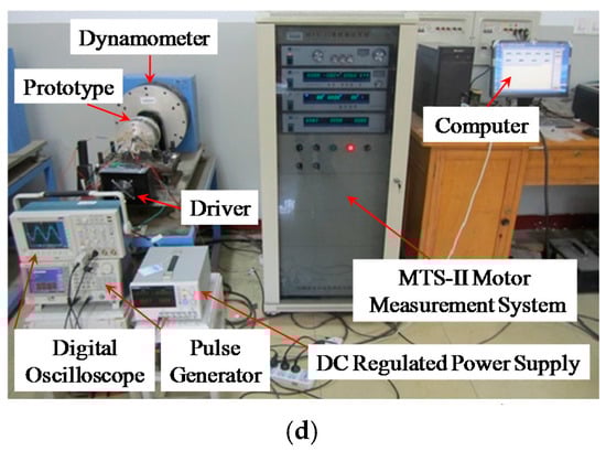 Prototype of the proposed 2-phase 8-pole 50-rotor-tooth SHSM. (a) Core laminations; (b) Rotor; (c) Stator and windings; (d) Experimental setup.