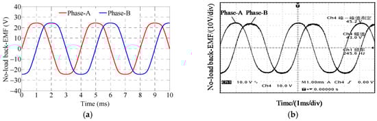 Figure 14 shows the calculated and measured waveform of the no-load back electromotive force (EMF). It can be found that the amplitude of the calculated one (about 24.5 V) is slightly greater than that of the measured one (about 22 V), mainly due to the fact that the motor’s end effect is neglected in the 2-D FEA. To take the end effect into account, the end coefficient kend can be adopted to modify the calculated results [24], which can be determined as kend = 0.9 according to the results in Figure 14.