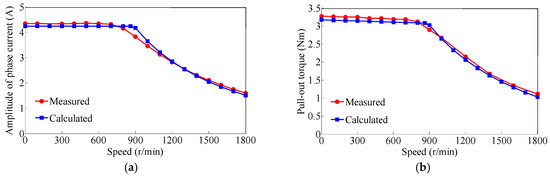 In the designed motor-drive system, the required parameters are measured: R = 1.2 Ω (at room temperature), L = 16.6 mH (in average), Rs = 0.5 Ω, UDC = 300 V, and the given current amplitude is Ig = 4.2 A. Moreover, the values of kE and kL can be determined by 2-D FEA as kE = 0.7 and kL = 0.024. Both the calculated and measured current-speed characteristics of the prototype are shown in Figure 15a. It can be seen that the calculated result coincides well with the experimental one.