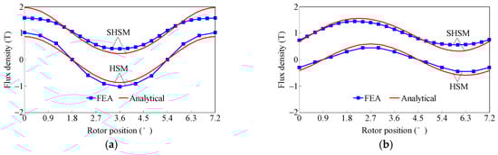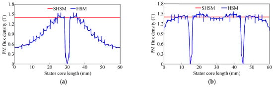 Figure 16 shows the comparison of the PM flux density characteristics, in which the calculation results of the HSM are obtained by 3-D FEA, whilst the optimal PM flux density Bpm0 = 1.4 T of the SHSM is determined by 2-D FEA. For Npm = 1, the maximum PM surface area is selected, and the calculated results can well verify the theoretical analysis. For Npm = 2, the PM surface area is adjusted to obtain the similar PM flux density characteristic to the SHSM.