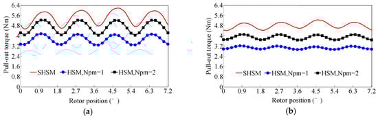 Figure 17a shows the comparison of the pull-out torque under rated currents with δ = π/2. It can be seen that the average pull-out torque of the HSM reaches about 4.8 N·m when Npm = 2, which is still lower than that of the SHSM of about 5.5 N·m. The FEA calculated pull-out torque density ratio is about ρ = 0.87, which coincides well with the theoretical one ρ = (le − Npmhpm)/le = 0.9. In addition, the unequal-tooth-pitch method [9] is usually adopted to reduce the torque ripples for stepping motors accordingly, and the pull-out torque calculation results with λs = 6.8° (stator tooth pitch) and λr = 7.2° (rotor tooth pitch) are shown in Figure 17b.