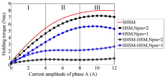 In this work, a comparison of the holding torque is carried out under the most idealized situation, namely, the saturation effect of the stator core except for the stator tooth region which is neglected in the HSM, with the results shown in Figure 19. It can be found that the torque difference of the two models increases almost linearly in region I, due to the lower iron saturation. In region II, the torque difference is almost unchanged, due to the influence of the relatively higher stator core saturation of the SHSM. In region III, the holding torque hardly increases and even decreases due to the oversaturation of the tooth-layer (see Figure 5), whereas the torque difference rises again since the tooth-layer saturation level of the SHSM is lower than that of the HSM due to the high saturation of the stator pole and yoke.