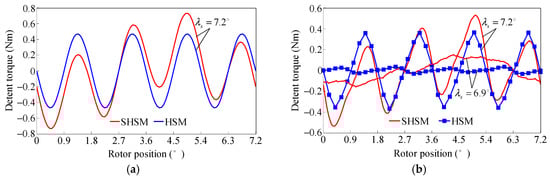 In the SHSM, any two stator poles separated by 180° are of inverse symmetry and have the same electromagnetic properties, as shown in Figure 8b. Moreover, the air-gap PM flux density of the stator poles nearer to the PMs is higher than that of the others, due to the shorter PM magnetic circuit. Therefore, the actual air-gap PM MMF drop of the stator poles nearer and farther from the PMs can be approximately determined as (Fδ + ∆F) and (Fδ − ∆F), where ∆F is the extra MMF drop considering the asymmetrical distribution of the PM magnetic circuit. As a result, the detent (cogging) torque of the HSM and the SHSM can be expressed according to the derivation in Appendix B as