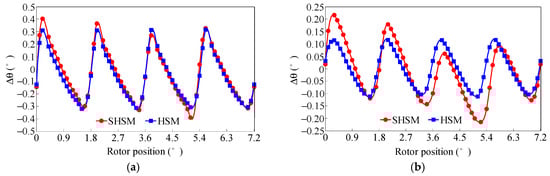 Figure 21 shows the comparison of the positional holding accuracy obtained by FEA according to Equation (16). It can be seen that the positional holding accuracy (∆θ) of the SHSM is lower than that of the HSM due to the higher torque ripple, especially under the unequal-tooth-pitch situation. On the other hand, the ∆θ shown in Figure 21b can hardly be improved in the open-loop operation, since the ideal sinusoidal currents have been employed and the torque ripple can hardly be reduced. In other words, the micro-stepping driving mode reaches the highest positioning accuracy of about ∆θ = 0.11° (HSM) and ∆θ = 0.22° (SHSM) for the specific torque angle δ even with infinite subdivisions, due to the limitations of the motor structure and operation principle.