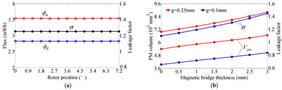 PM flux leakage and utilized PM volume of the SHSM. (a) g = 0.25 mm, tbge = 1.5 mm; (b) g = 0.1–0.25 mm, tbge = 0–3 mm.