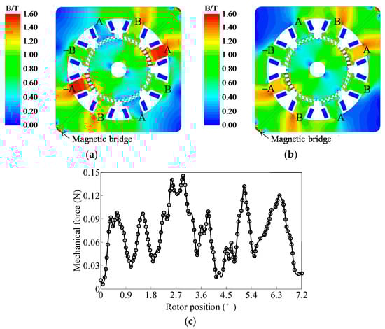 Mechanical force analysis of the SHSM. (a) Magnetic field distribution with PMs only; (b) Magnetic field distribution with phase-A energized; (c) Stator mechanical force during operation.