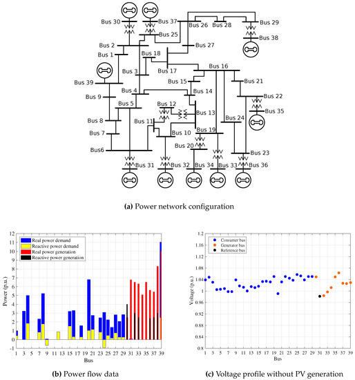 The 39-bus and 57-bus power systems were taken as benchmark examples to analyze the performance of voltage regulation schemes. The 39-bus and 57-bus power systems consist of different network topologies, initial system parameters, and size of consumer power demands. The 39-bus power system is generally representative of the New England power system, with 10 generators, 46 branches, 29 consumer buses, and large size of power demands allocated among consumer buses [25]. The 57-bus power system represents a simple approximation of the American power system, with seven generators, 80 branches, 50 consumer buses, and relatively small size of consumer power demands sited among consumer buses [26]. The analysis results of the two systems were compared to evaluate the performance of the LASSO method which resulted in similar tendencies in the effects of voltage regulation. The 39-bus power system is mainly chosen to demonstrate the results; the basic information of this system is shown in Figure 1a. Figure 1b shows the associated benchmark data. The buses from 1 to 29 are consumer buses, where the blue bars indicate real power demand and the yellow bars are for reactive ones. The buses from 30 to 39 are generator buses, the red bars are for real power generation and the black bars are for reactive ones. Using the power flow Equation (1), we can compute the voltage of each bus as shown in Figure 1c. Note that this is computed under the absence of PV generation. The voltage profile would change in the presence of PV generators, and we will analyze its influence in the following subsections.