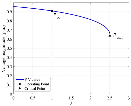 where , and , are the vectors of base power injection and target power injection in the power system. The effects of PV real and reactive power integration on voltage stability could be analyzed by varying the value of and . An example of nose curve at one bus i is shown in Figure 2, which expresses the relation between voltage magnitude and power injection at the bus; is the voltage stability limit (critical) point, is the current operating point.