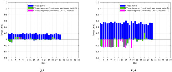 Examples of PV power generation at consumer buses with uniform distribution of PV generators at consumer buses of the 39-bus power system. Net real power generation of PV is and of the net real power demand at consumer buses respectively, and the corresponding reactive power set point of PV inverters computed with the constrained least-square method and constrained LASSO method. (a) Net PV real power generation is of the net real power demand at consumer buses; (b) Net PV real power generation is of the net real power demand at consumer buses.