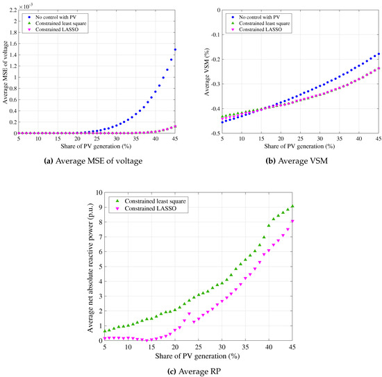 Let us go into a more detailed analysis. The share ratio of the net PV generation amount to the consumer demands was scanned, ranging from 5% to 45%. For each choice of the share ratio, random distributions were repeated 5 times. The averages of the corresponding indices (MSE, VSM and RP) over five trials are shown in Figure 4. The average of voltage in Figure 4a shows that voltage magnitude varies severely with respect to the increase of PV power integration when no voltage regulation is applied to the PV inverters. Meanwhile, the constrained least-square method and constrained LASSO method control voltage deviation effectively compared with the no control case. The average in Figure 4b shows that the voltage stability of the 39-bus power system decreases with respect to the growth of PV generation, although the PV inverter reactive power control with the constrained least-square and constrained LASSO method results in the improvement of system voltage stability compared with the no control case. In addition, the results in Figure 4a,b explain that the constrained least-square method and constrained LASSO method show very similar effectiveness on voltage regulation. However, the net absolute reactive power generation from PV, with respect to the increasing PV power generation plotted in Figure 4c, shows that voltage regulation with the constrained LASSO method results in less reactive power generation from PV inverters than with the constrained least-square method. In other words, the constrained LASSO method succeeds in selecting the minimum required number of PV inverters to control voltage variation, while maintaining the same effectiveness on voltage regulation as the constrained least-square method.
