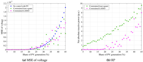 As opposed to the previous case, the authors consider the non-uniform, weighted distribution of PV generators, meaning that PV generators are only assigned to consumer buses with real power demand. In this case, the real power generation of PV at each bus is proportional to the consumer real power demand at the bus, where the PV/demand ratio is equal at each PV-enabled bus. The share ratio also ranges from to . The authors name this case as on-demand distribution of PV power generators. The corresponding indices (MSE and RP) are shown in Figure 5. The net absolute reactive power generation from PV results in smaller value with the constrained LASSO method than with the constrained least-square method in Figure 5b. The constrained LASSO method shrinks the amount of inverter reactive power generation in the case of the on-demand distribution of PV generators. However, MSE of voltage varies severely with respect to the increase of PV real power generation in Figure 5a. The main reason is the validity of the linearization technique employed while formulating the control schemes. The linearization of power flow Equation (1) induces computing error to the voltage regulation process, and the reactive power constraint shown in Equation (7) accumulates this error when the number of PV-enabled buses declines. In the 39-bus power system, the number of PV-enabled consumer buses decreases in the on-demand case, since there is no power demand at some of the consumer buses. Consequently, the potential voltage regulation points of PV inverters became fewer, which impacted the precision of voltage regulation (MSE) to a certain extent. However, the authors consider that proper reference voltage design may suppress the computing error and improve the performance of MSE; a comprehensive study on this topic is left for future work.