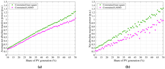 Net absolute reactive power generation from PV inverters with the constrained least-square method and the constrained LASSO method in the 57-bus power system. (a) In case of uniform distribution of PV generators; (b) In case of on-demand distribution of PV generators.