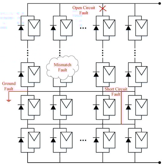 Generally, PV system faults can be classified into two types []: (1) irreversible error caused by mechanical or electrical problems, such as open circuit, short circuits, and PV cell aging; (2) temporary power loss faults that are caused by sheltering, such as cloud shadows. Figure 1 gives a brief description of those faults in a PV system.