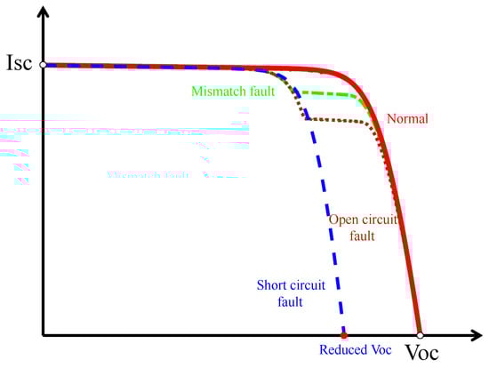 Different types of faults impact a PV system in different aspects (e.g., variation of voltage or current), and hence produce different I-V characterization curves []. Figure 2 shows the curves for several typical types of faults. A short circuit fault will bring a reduced open circuit voltage () compared with the normal curve. The mismatch fault and open circuit fault will present similar morphology with an inflection point (Mathematically, inflection points are the un-derivable points of an I-V curve and a more detailed description is shown in []), but the I-V curve parameters are different for the two types of faults. Hence, the I-V curves can be used in fault detection and verification in our algorithm.